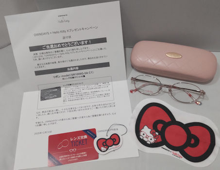 「OWNDAYS × Hello Kitty X(エックス) プレゼントキャンペーン」に応募、キティちゃんのメガネ(リボン model SR1009G-5A)が当選しました。とっても嬉しいです!「リボン越しにハローキティがちらりと覗くデザイン」というのがとっても魅力的で気になっていました。実際届くと、キラキラしたキティちゃんやおリボンがとってもかわいい!