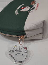 ポーチは表は横座りのキティちゃん。裏はキティちゃんに加えてなんとミミィちゃんが登場!キティちゃんミミィちゃんコンビが大好きなのでとても嬉しいデザインです。珈琲館の美味しそうなメニューに囲まれて2人とも珈琲館の制服がぴったりお似合いです。チャームもキティちゃんとミミィちゃんなのがまた素敵。コーヒーカップに入ったキティちゃんとミミィちゃんが可愛いですね。