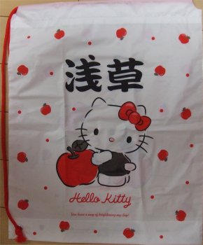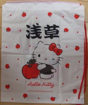 干し梅を頂いた後は巾着として使っています。お祭りモードのキティちゃんが元気でキュート!後ろ姿も、なかなか粋です。中にチェーンキーホルダーが入っていたので巾着に付けました。