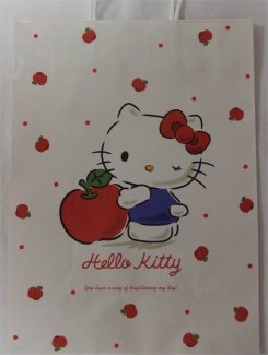 「HELLO KITTYルーム」に宿泊した際に頂けるバッグ。ホテルオーレの制服を着たキティちゃんが可愛らしいです。以前頂いた時よりも色合いが落ち着いた色合いになっています。