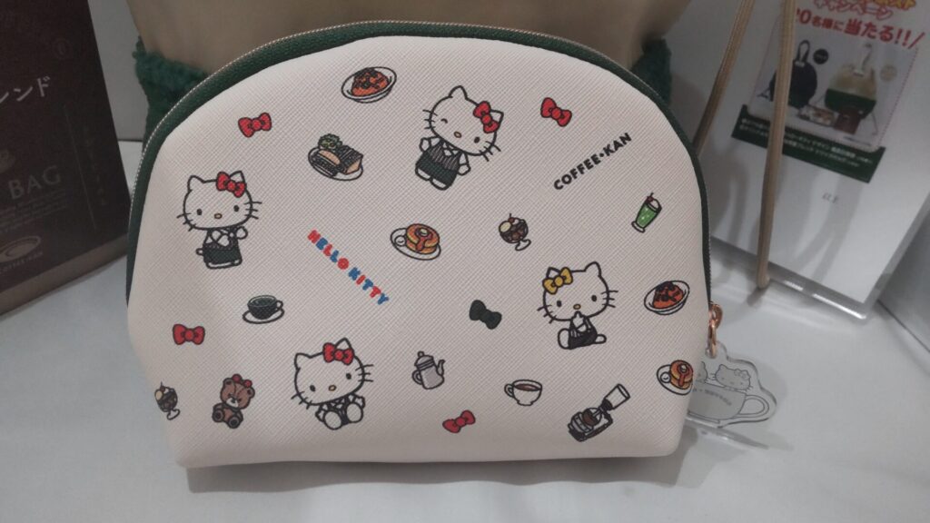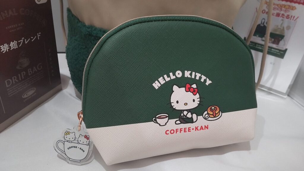 内容は、ボア巾着バッグ、オリジナルポーチ、珈琲館ブレンド ドリップバッグ1箱(5杯分)、ハローキティデザイン商品引換券 2枚綴り(「トラディショナル・ホットケーキ ホイップクリーム付き2枚(単品)」・「珈琲館のハウスサンド(単品)」です。