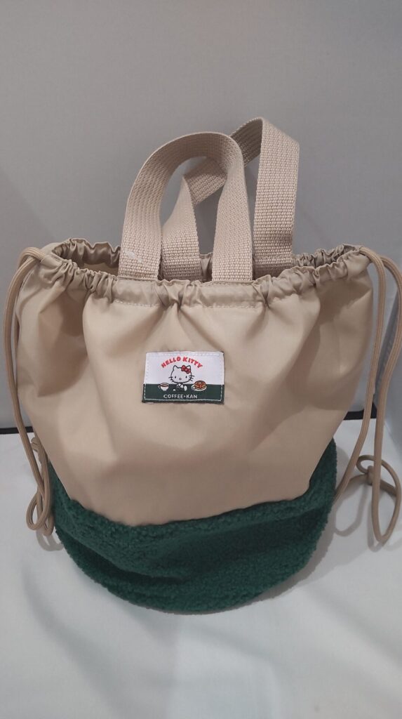 珈琲館の制服を着た横座りスタイルのレトロなキティちゃんのネームタグ付き。グリーンのもこもこが可愛い!いっぱい入りそうです。